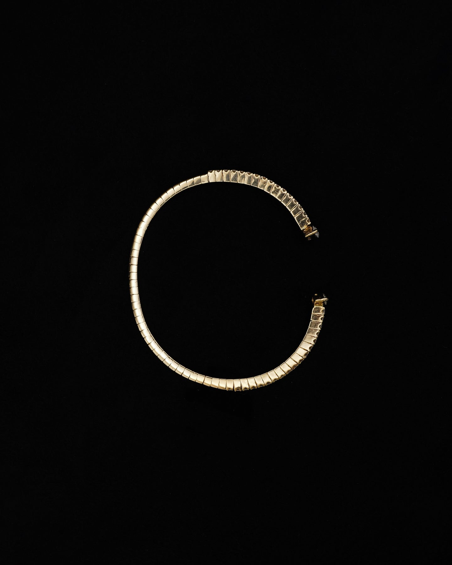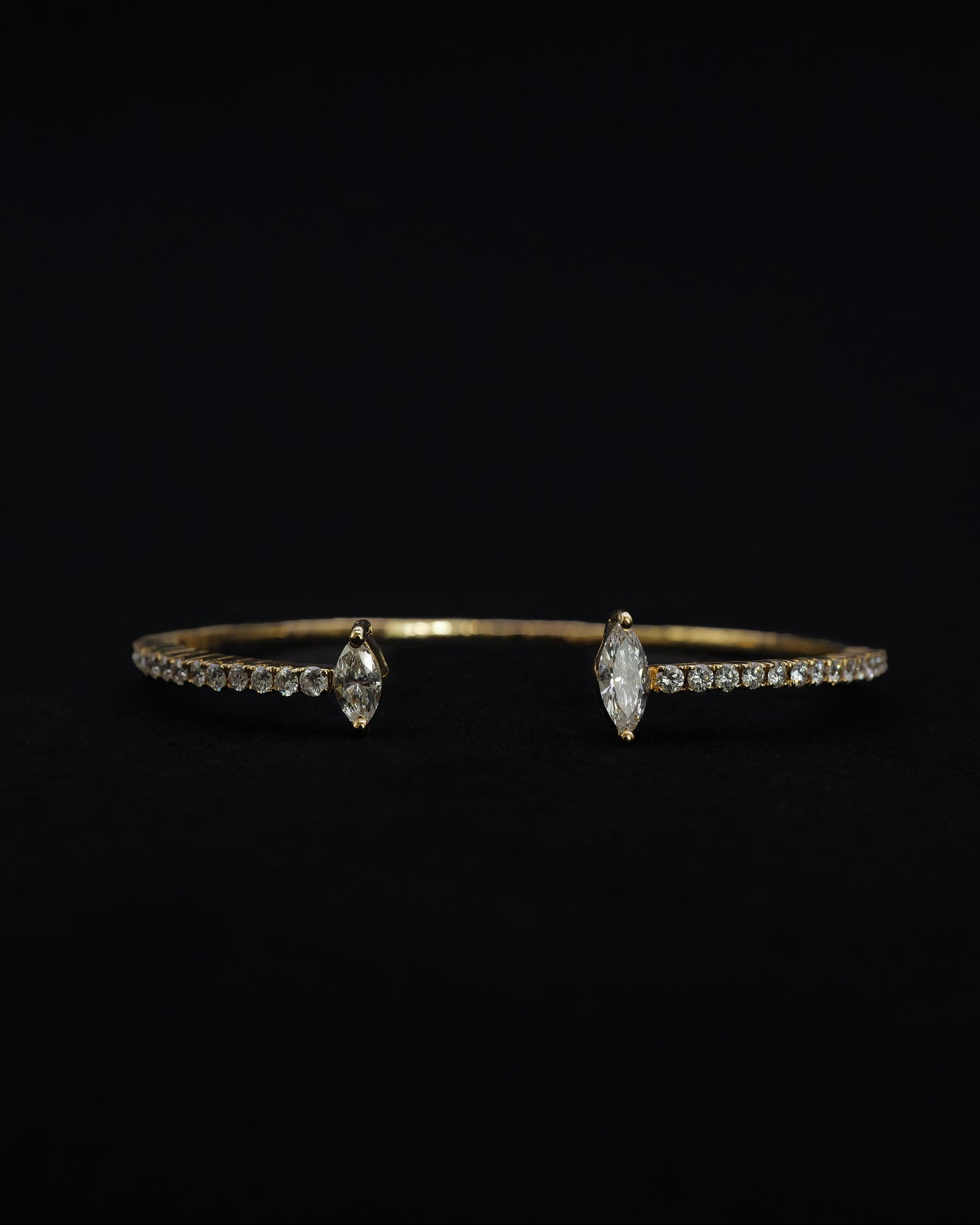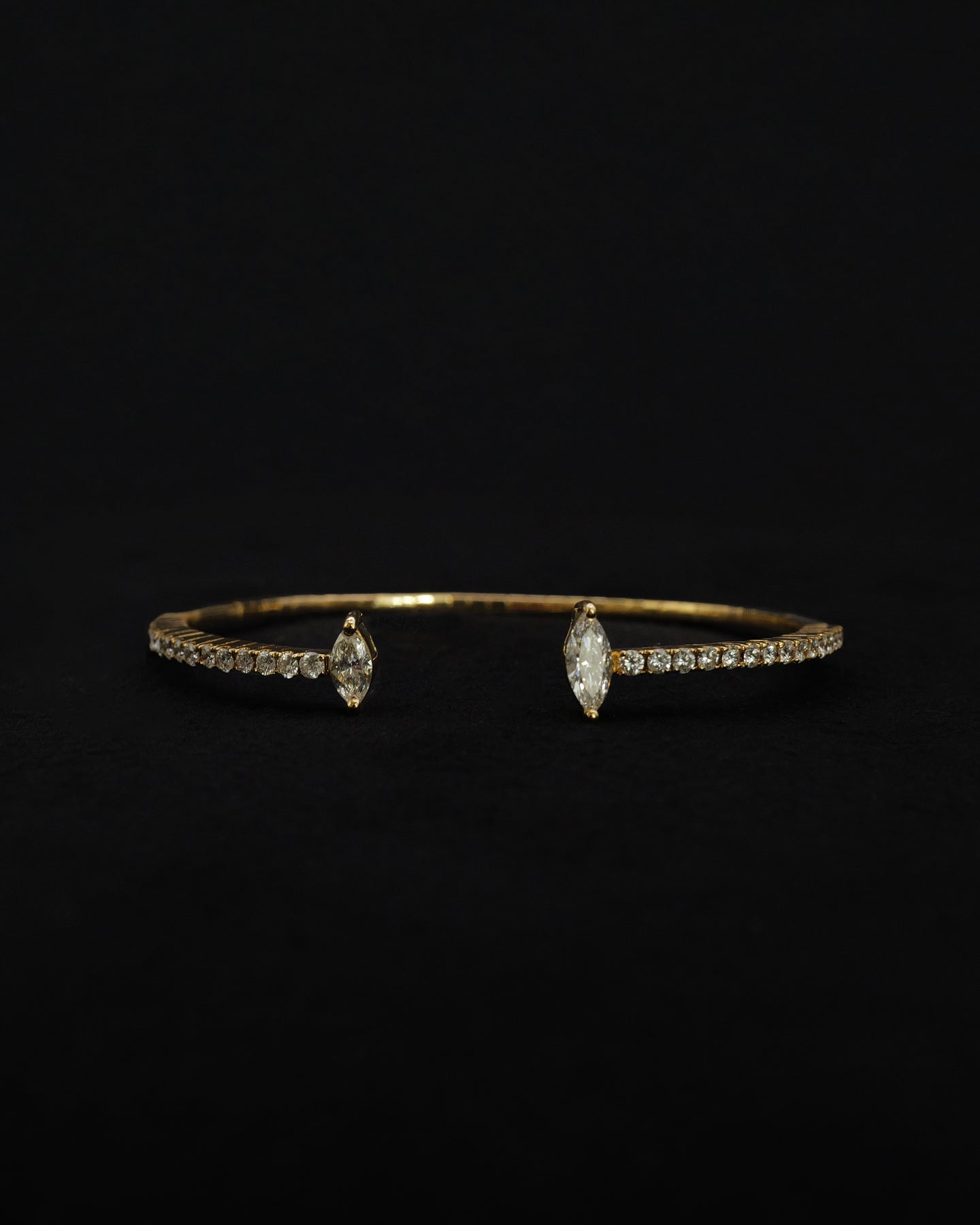 This 18K yellow gold bangle showcases two marquise-cut diamonds at each end, totaling 0.51 carats, complemented by 84 round brilliant diamonds along the band totaling 1.35 carats.Ā