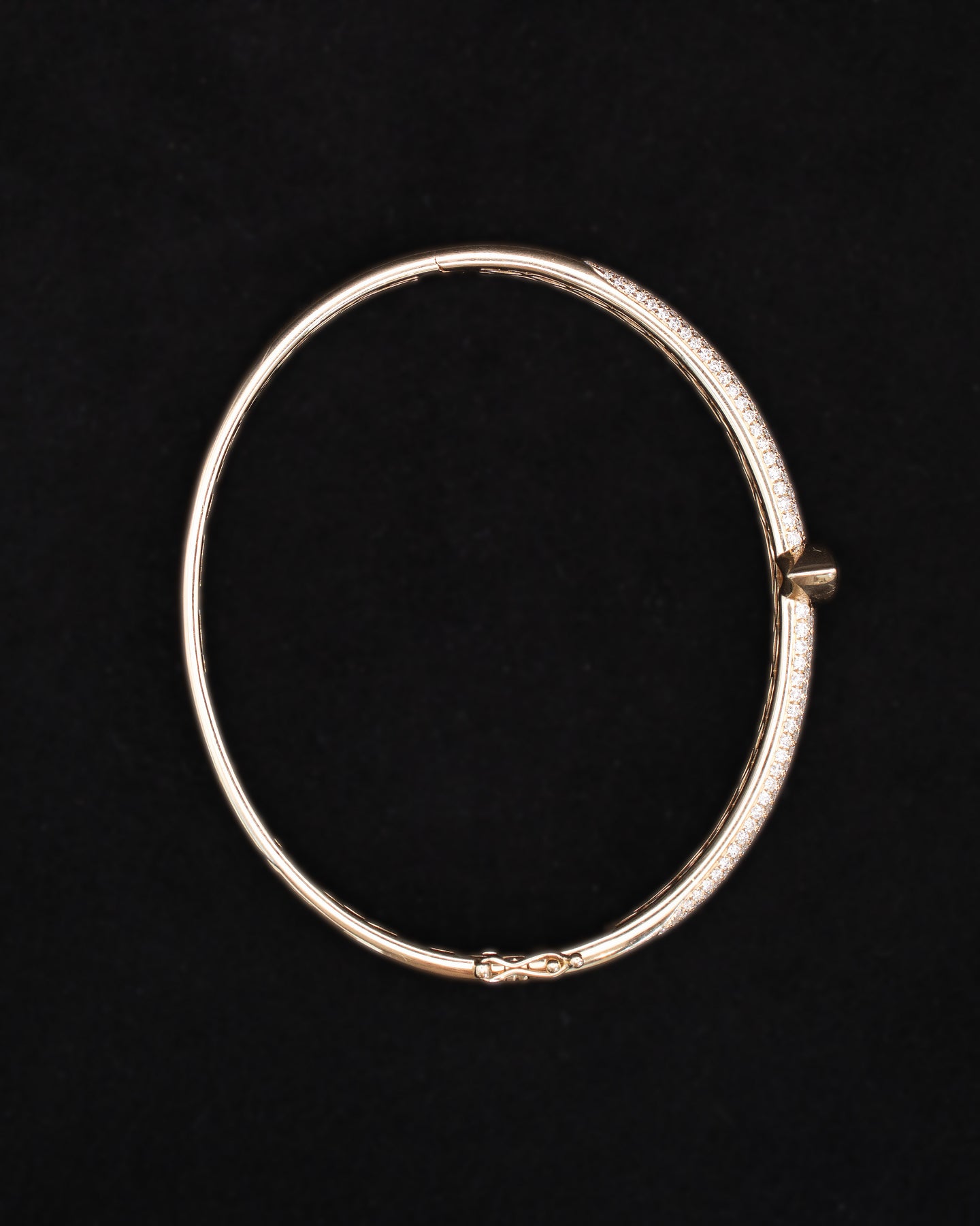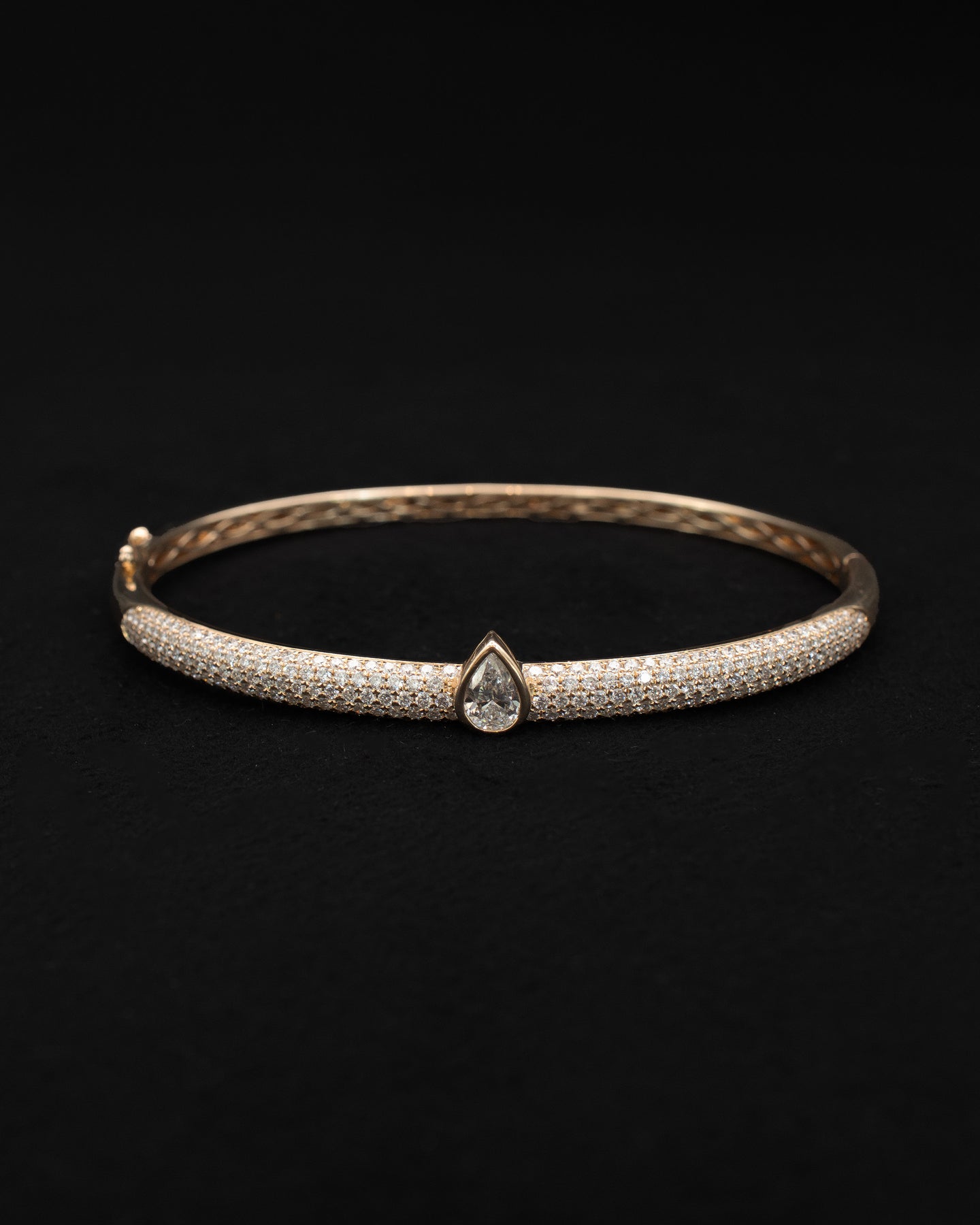 This 14kt gold bangle is set with 2.3 carats of diamonds, featuring a bold pear shaped diamond centerpiece surrounded by rows of shimmering pavé stones. Measuring 4.5mm wide, it’s designed with a secure hinge and safety lock for elegance and wearability.