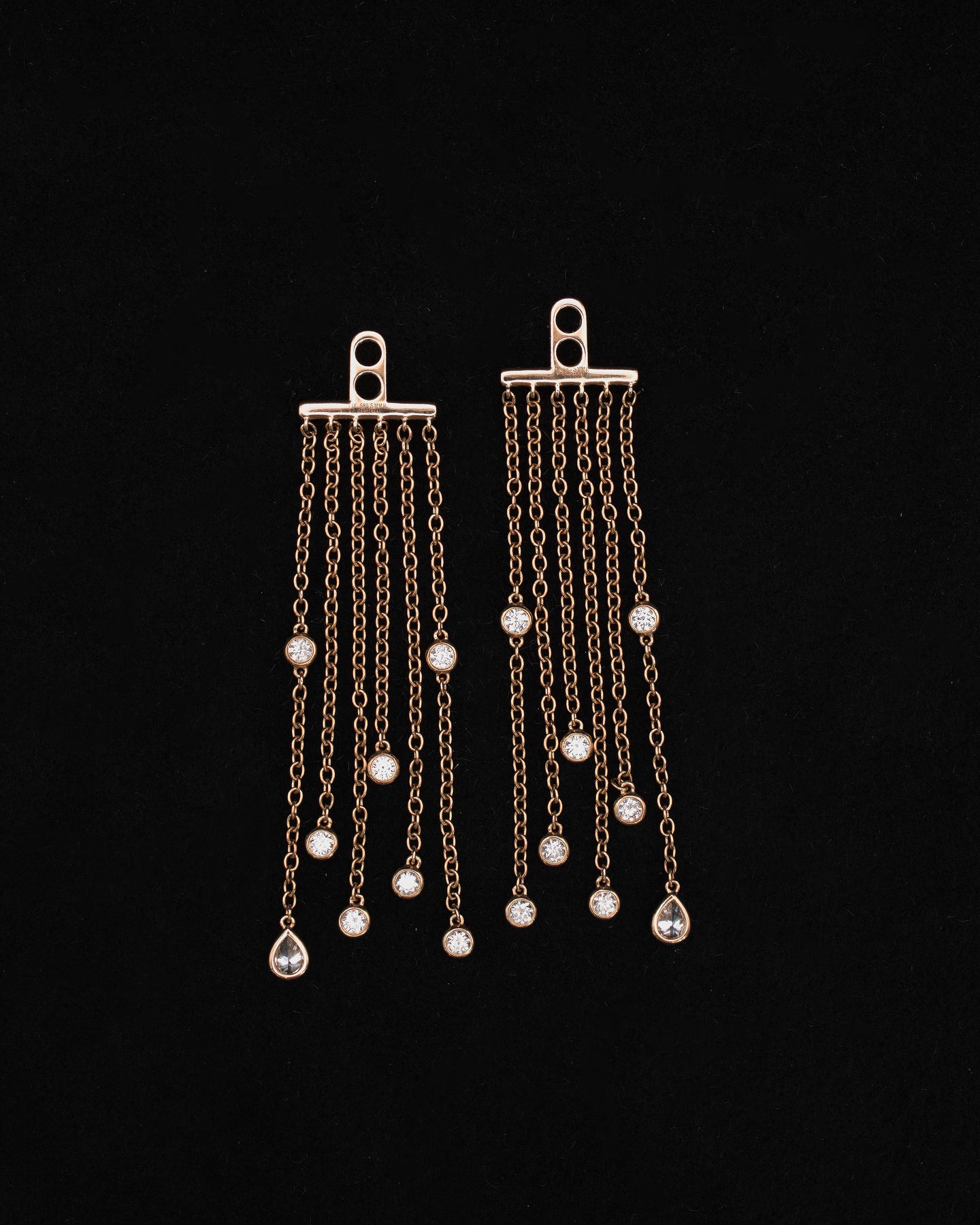 Elevate your studs into a show stopping statement. Crafted in 14kt gold, these diamond cascade earring jackets feature 1.00 carat total weight of diamonds. Bezel set round diamonds shimmer along delicate gold chains, finished with pear cut drops for added brilliance. At 60mm long, they move with you, catching the light from every angle.