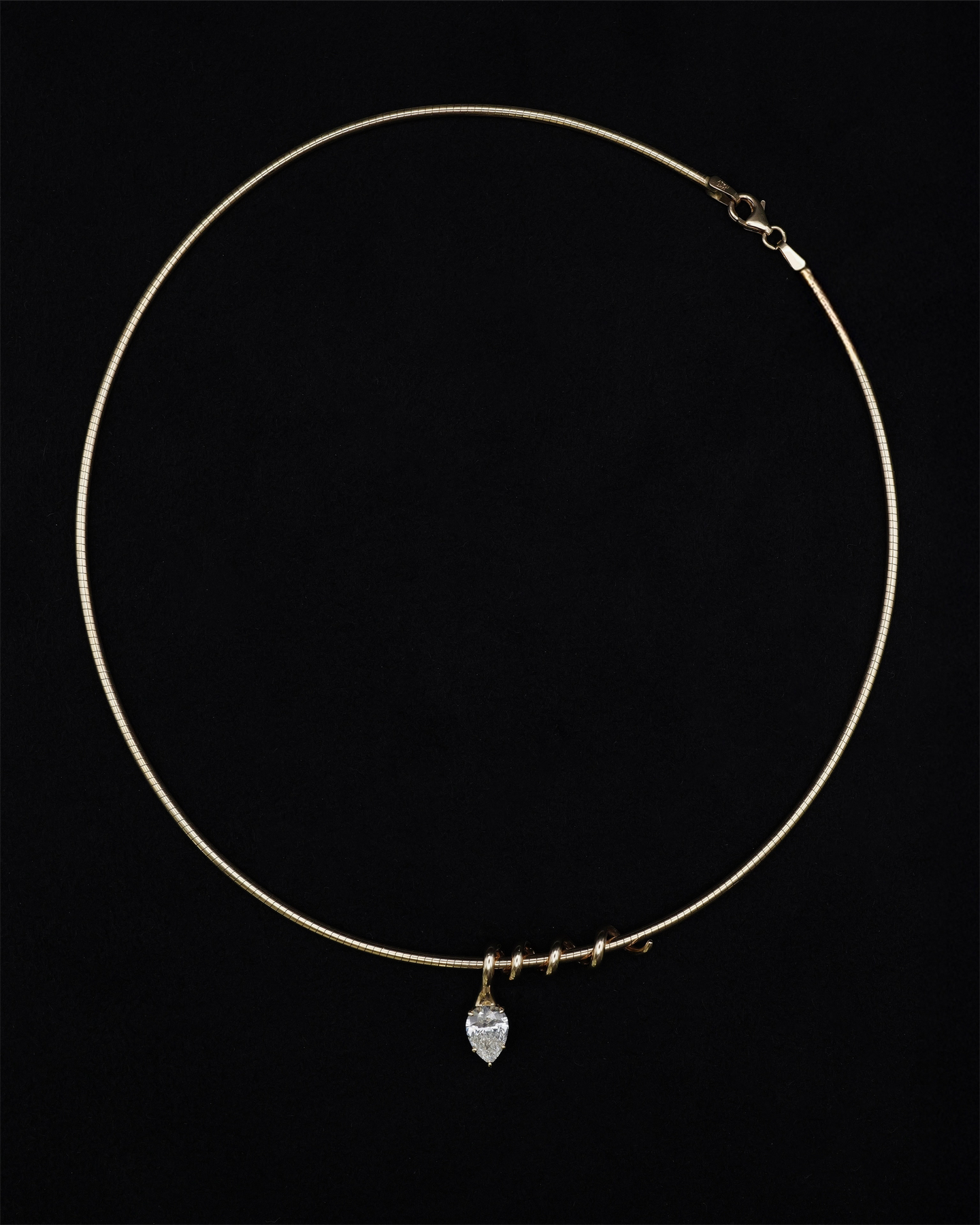 A striking blend of modern minimalism and timeless elegance. Crafted in 14kt yellow gold, this 16 inch necklace features a 2mm gold collar with a stunning 1.2ct pear shaped diamond. The floating design allows the diamond to catch light from every angle, creating an effortlessly sophisticated statement.