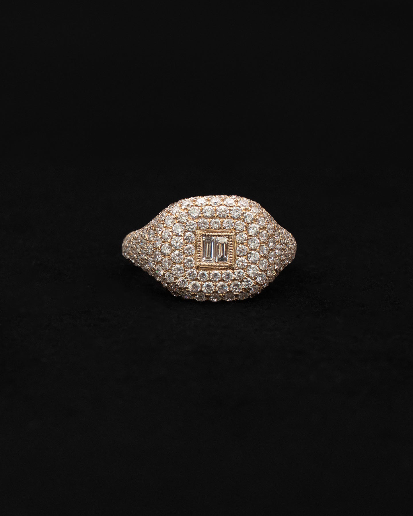 This pavé setting double baguette signet design is crafted in 14kt gold and encrusted with 1.8 carats of diamonds. Two baguette cut stones shine at the center, framed by layers of pavé brilliance for maximum sparkle.