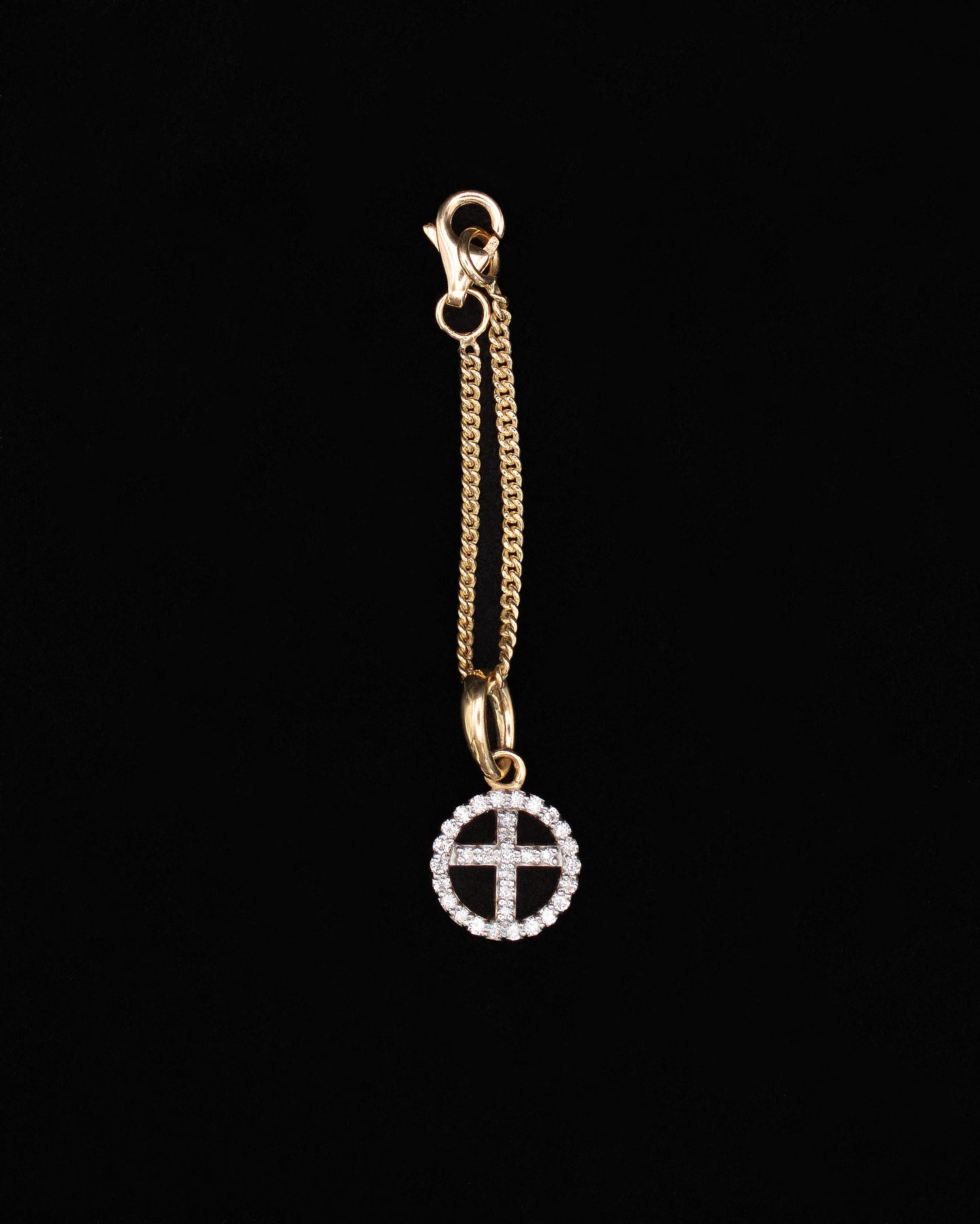 A symbol of faith and devotion, crafted in diamonds. This elegant cross charm is made in 14kt gold and outlined with pavé-set diamonds for radiant brilliance. Designed with a lobster clasp, it attaches securely to your watch or bracelet. A timeless emblem of strength, grace, and belief worn close at hand.